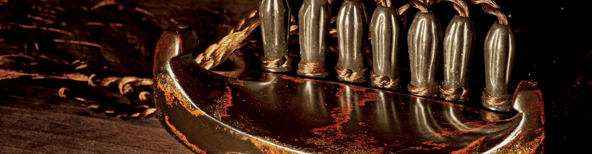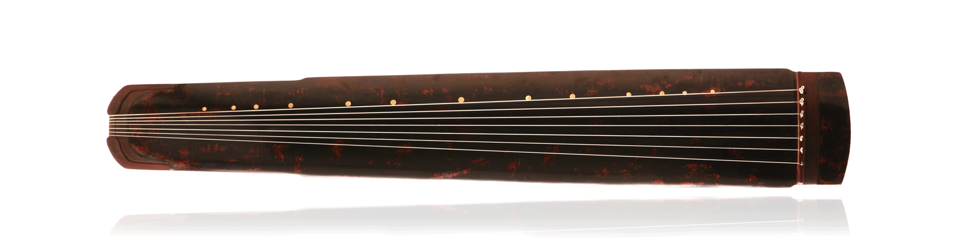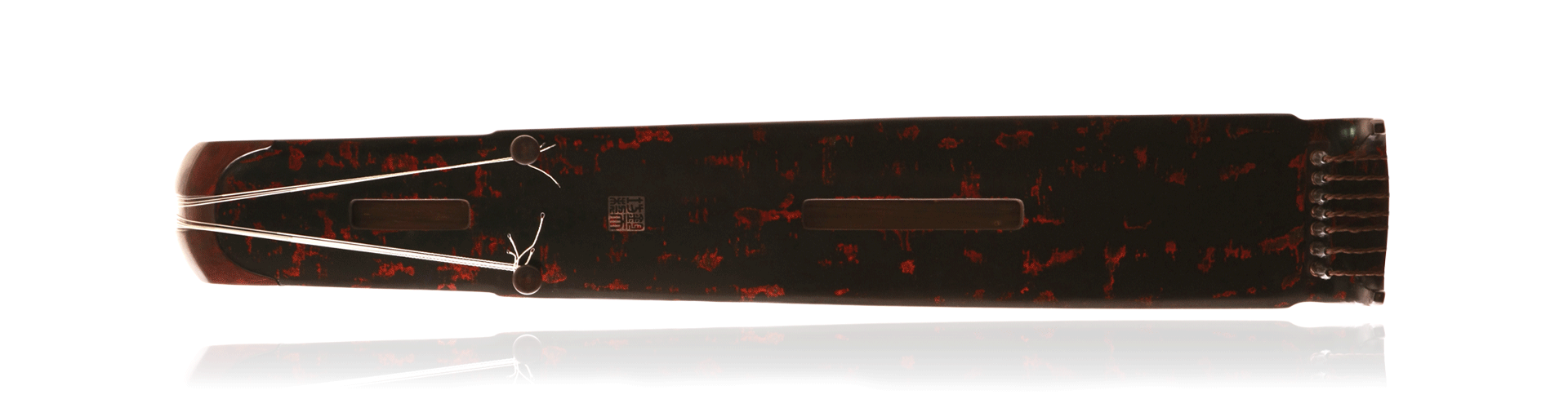 钧天坊制秦琴式,通体黑漆,朱砂散嵌,因而光彩斑斓。秉承此式极简线条,横置如“一”,琴额相较于岳山以下略窄,琴身笔直而下,至腰尾处略削其宽,但仍不失其挺直,通体一气呵成。其高古中正的造型如劲耸巍峨,彷若《诗经˙小雅》所歌:“高山仰止,景行行止。”透显了先秦圣贤所遗宏德,抚之常生追慕之情。