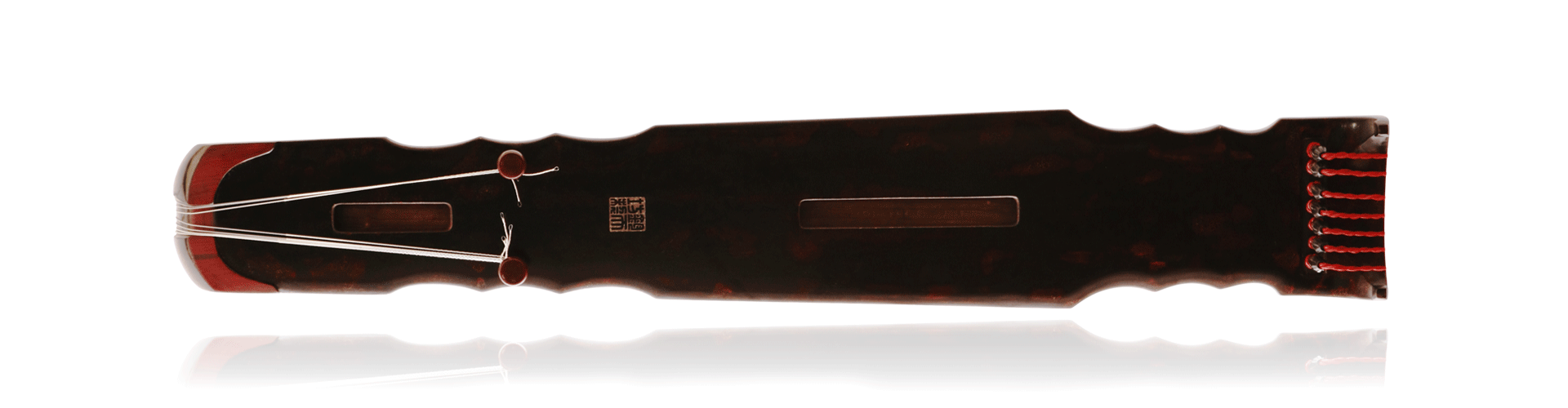 钧天坊制“大三连珠”,形制为连珠式原型,即项腰各作三个连续半月形弯入,龙池凤沼皆为方正;通体黑漆,随藏朱斑。此琴纵身修长,也是钧天坊所制有效弦长最长的“连珠式”古琴。“大三连珠”造型灵动跳跃又不失端庄典雅,观之抚之,可见范仲淹《岳阳楼记》“浮光跃金,静影沉璧”之态,动静互容,两相合宜。