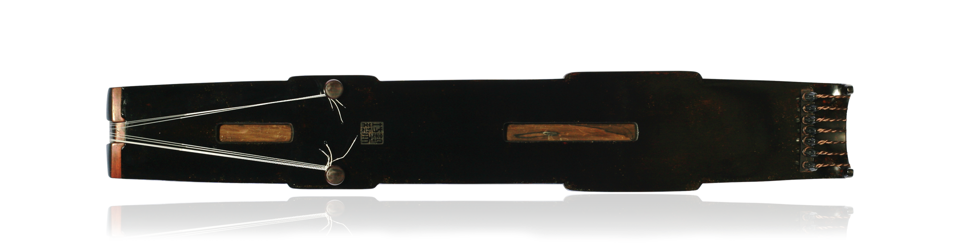 和鸣,意为互相应和而鸣,用以形容庄严和谐的乐声,《诗·周颂·有瞽》即有“喤喤厥声,肃雝和鸣”。此琴在太和、中正的主体基础上,又施以变化,即琴体两处外扩,仿如两个“中”字上下并立,相互应和共鸣。琴面通体黑漆,偶有斑驳;造型恢弘肃穆,亦显灵动;抚之可感徐上瀛《溪山琴况》之“和”意境:“其有得之弦外者,与山相映发而巍巍影现,与水相涵濡而洋洋倘恍。”即琴与天地山水天籁和鸣,令人“神闲气定,蔼然醉心”。