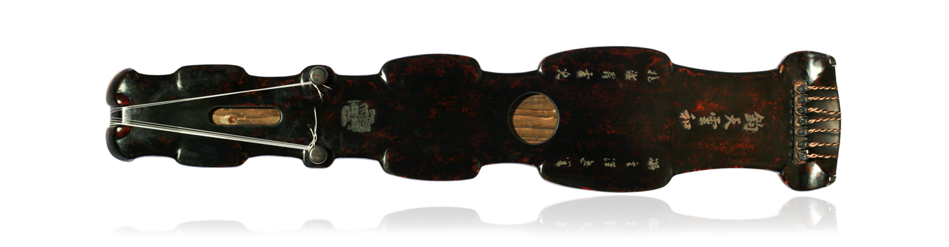 逸响,原意为雄浑奔放的音乐或诗文,元朝张简即有诗云:“鸣琴发逸响,嘉树含清辉。”刘勰《文心雕龙·隐秀》亦有:“动心惊耳,逸响笙匏。”都是描述音乐的浑然劲健。此琴选材与音色足见“凝云汉逸响,抱娑罗灵光”之境,形神韵三者堪称融为一体。其以战国器物云纹为创作元素,琴体线条奔涌,如云卷腾。琴头作椭圆,身形凹凸交错,除头尾外通体有四处外展,大小不一。造型大胆豪放,颇具钧天神韵、更显逍遥世外之宏大气象。