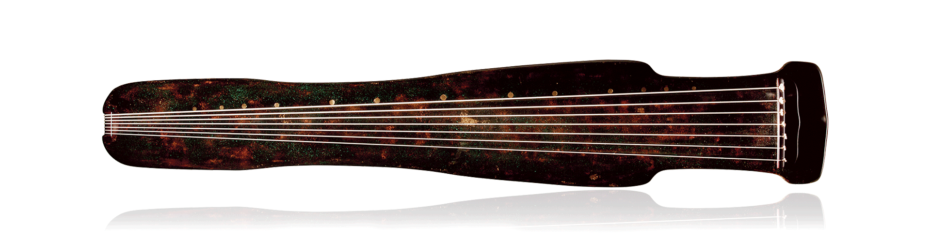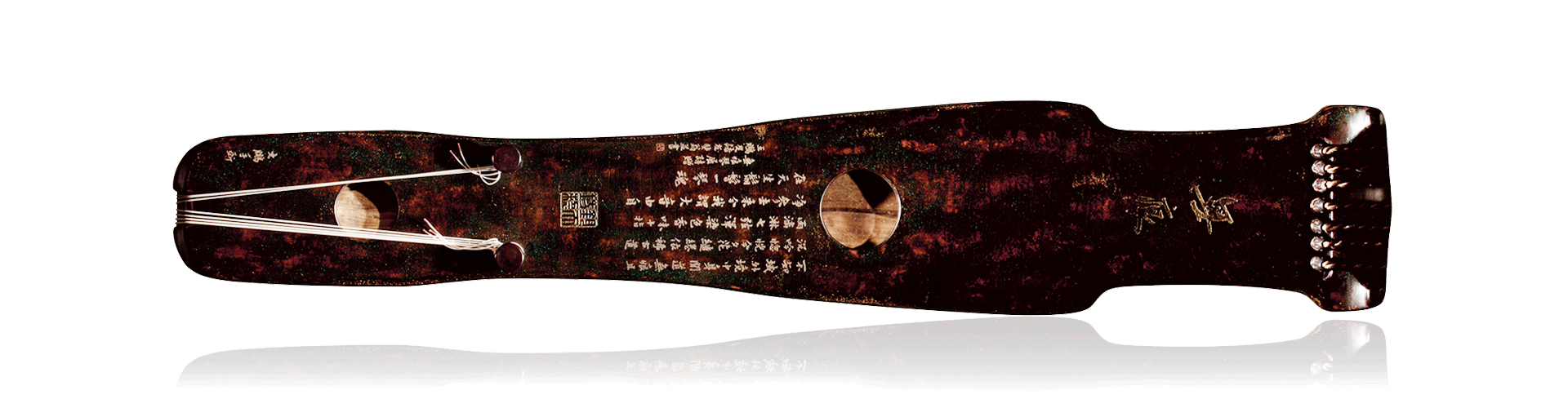 琴体面板采用明代杉木老梁,底板为苍韧梓木。工艺采用古法“八宝灰胎”之方,以孔雀石、绿松石、朱砂、大漆营造高古青铜质感,通体朱蓝错置、褐绿掩映、斑斓夺目。另镶金徽玉轸,岳山、焦尾、雁足等处皆陈小叶紫檀。琴弦为传统天然蚕丝弦,其与琴身克谐,将琴本有的古朴、清润音色演绎到极致,又毫不遮覆其琤瑽金石之声,神韵交彰。