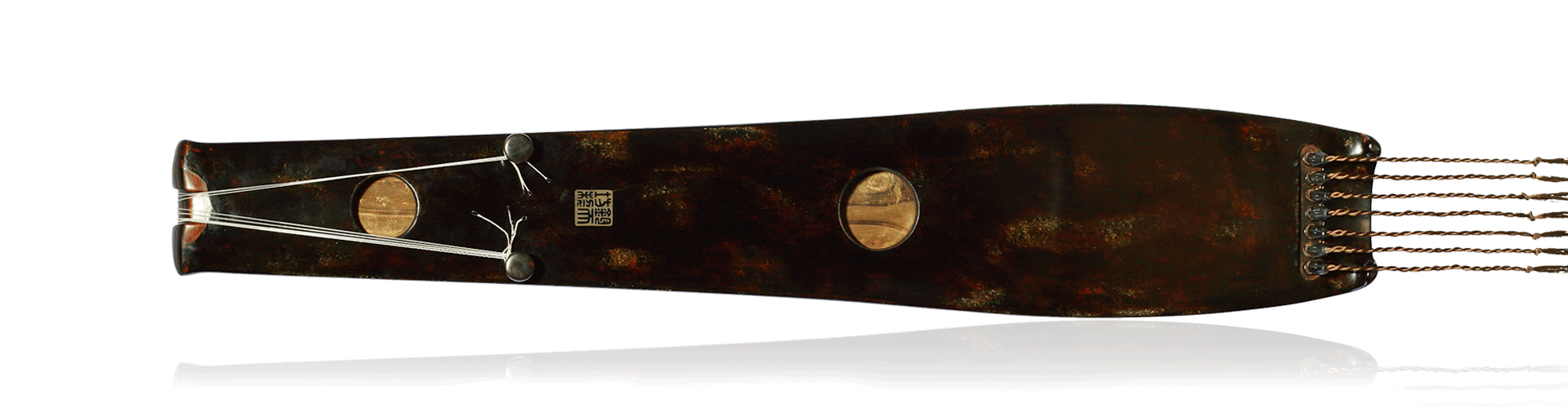 “净瓶”采用明代杉木老梁所制,髹之以黑漆,镶嵌以朱砂,容色多彩并流溢光泽;徽镶螺钿,轸悬墨玉,岳山焦尾雁足等处配以小叶紫檀;龙池凤沼皆为浑圆,出音静雅清和。抚之不仅可感甘露盈瓶之慈悲情怀,更可观照自身,体悟终极净善,正如六祖慧能之禅悟:“菩提本无树,明镜亦非台。本来无一物,何处惹尘埃。”