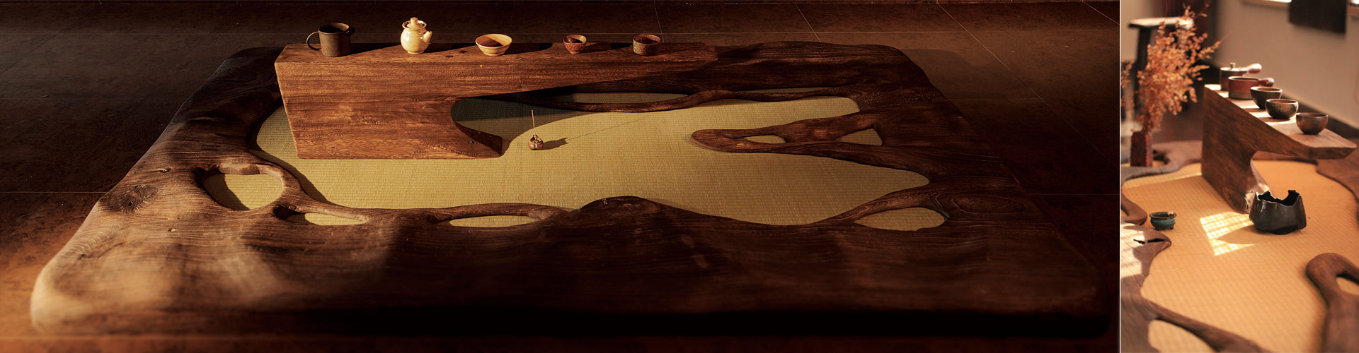 在设计师的手中,木材是一种充满生命力、可刚可柔的造型材料,正如这款三人座的禅茶席,采用木材与榻榻米结合的方式,以及流线型水纹镂刻的手法还原出一个端坐岩边清泉水洼、静听风声鸟鸣、悠然品茗回归自然的情境;水洼形的镂空位巧妙地将三人位蕴含其中,茶台清爽的直线与周边拟于自然的流线形成对比,简洁利落;水生木,而茶道恰是水与木相结合的自然之道的灵魂升华,禅茶一味,可见一斑。