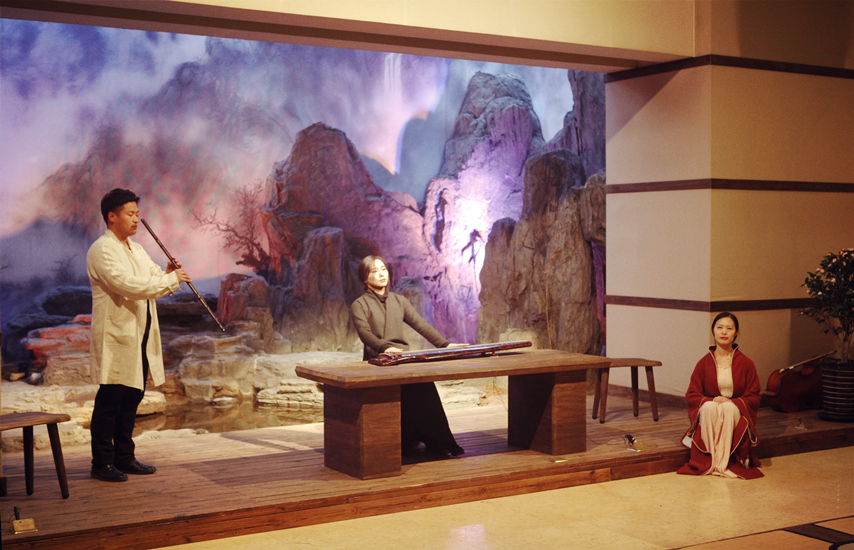 随后,钧天云和艺术家为来宾做了不同形式的古琴音乐演出,古琴独奏、琴歌、古琴与大提琴即兴……古今中西的演绎融合展示了古琴艺术传承的生命力和创新精神。
