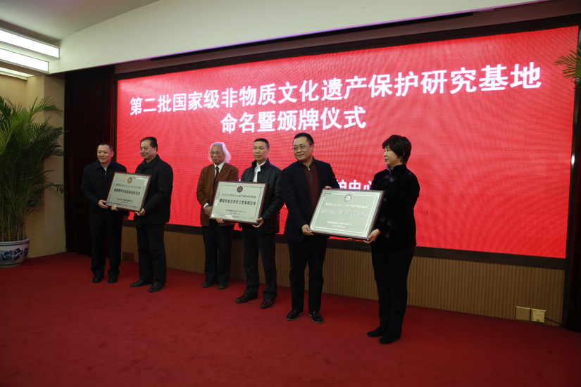 本批“国家级非物质文化遗产保护研究基地”称号的九家单位有:河南省文化艺术研究院、北京朝阳京剧文化中心、北京钧天坊古琴文化艺术传播有限公司、福建南平市建窑陶瓷研究所、莆田市善艺李氏工艺有限公司、康定大吉香巴拉文化发展有限公司、景德镇佳洋陶瓷有限公司、杭州十竹斋艺术馆、龙泉市夏侯文龙泉窑研究所。据悉,2013年1月,首批获得此荣誉的分别为苏州市苏绣艺术创新中心、南通蓝印花布艺术馆、禹州市苗家钧窑有限公司和福建省仙作古典工艺家具研究开发有限公司。