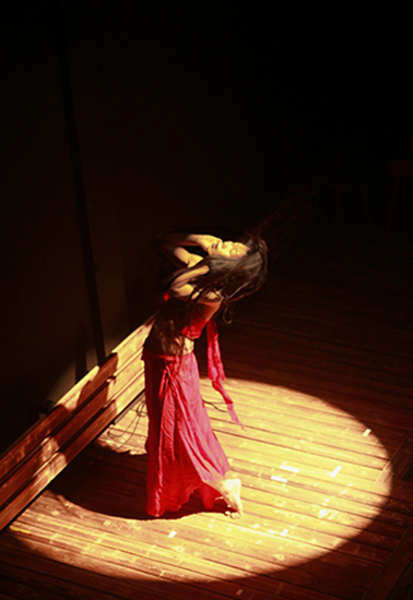 走得远了、久了,会疲惫迷茫,需要停下来歇歇脚。箫者转换角色成为琴人,歌者拿起八角鼓敲起鼓点,一袭红衣的舞者现于灯光之下,用身体演绎一生的历程。她在现实与梦幻中游历,于矛盾交织中寻找自我的突破,具有一种原始的吸引力,连同我们内心的挣扎与苦痛一起带了去,没有痕迹。