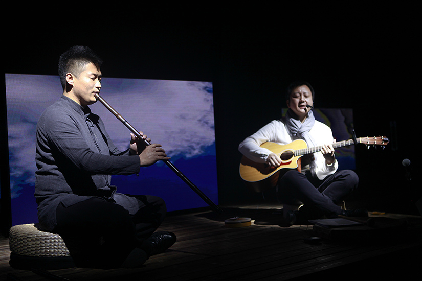 行走中看到的风景,体悟的人文,无不引发我们向心灵深处探溯。歌者吉他弹唱,梵语、呓语的交织,让人陷入沉思。箫声回旋,大提琴如大地般柔和沉稳的加入,纵深了音声中的思索。