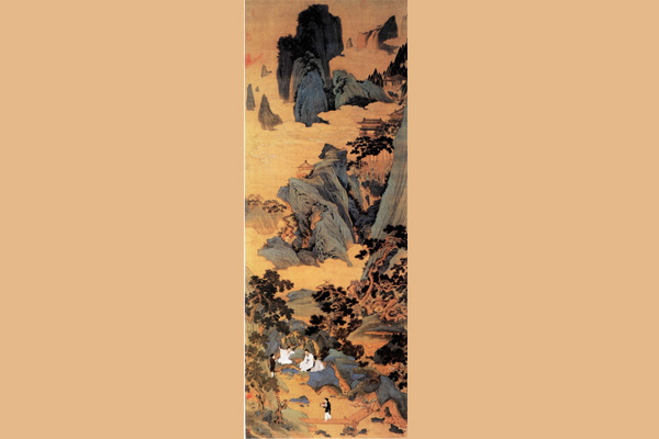 全画以竖幅高远章法,分三层叠进,近景为深壑、小桥、流水,桥上有童子捧瓯而过。尤其洞口水边有一位仙者弹琴,两位仙者于旁静听,传神入微。仙者傍依的山根岩石间,有山桃杂卉伴卧松而开放,古松自右岸斜坡横卧于洞顶,松皮龙壳,青藤盘绕,与左岸山岩之山桃相呼应,境界超逸。